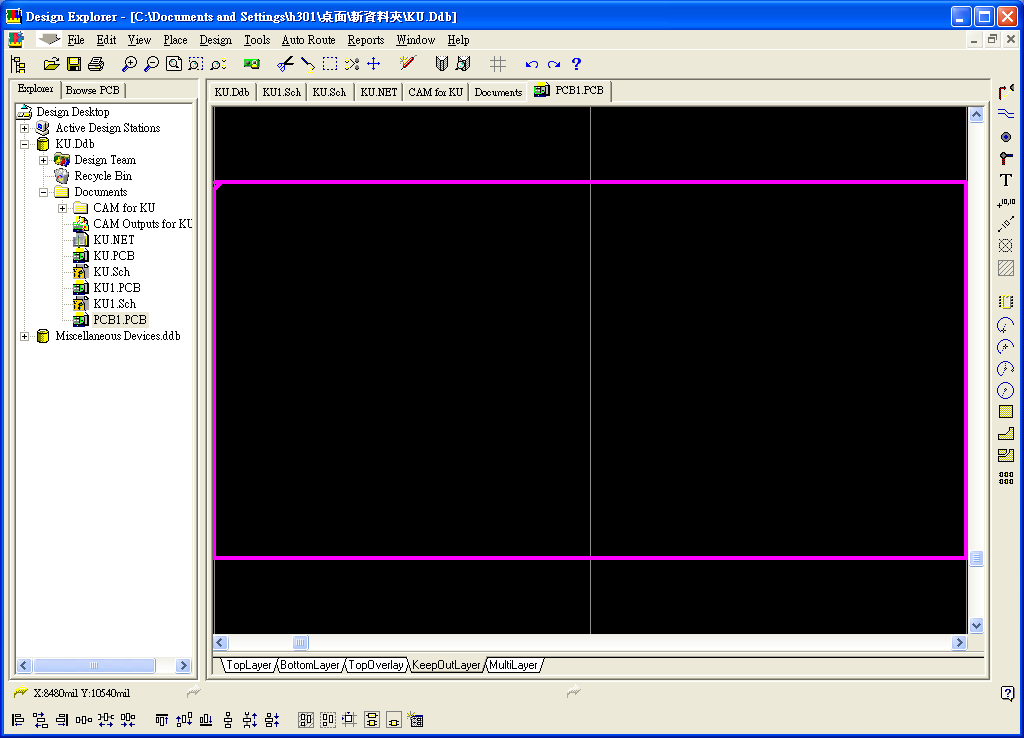 雙擊新命名之PCB檔,進入PCB布線畫面,先點選畫面下方之KeepOutLayer頁面標籤,再用畫面右側(cè)之繪圖線畫出邊框線,如圖14。畫面一樣用PageUp或PageDown調(diào)整至適合大小做繪圖。